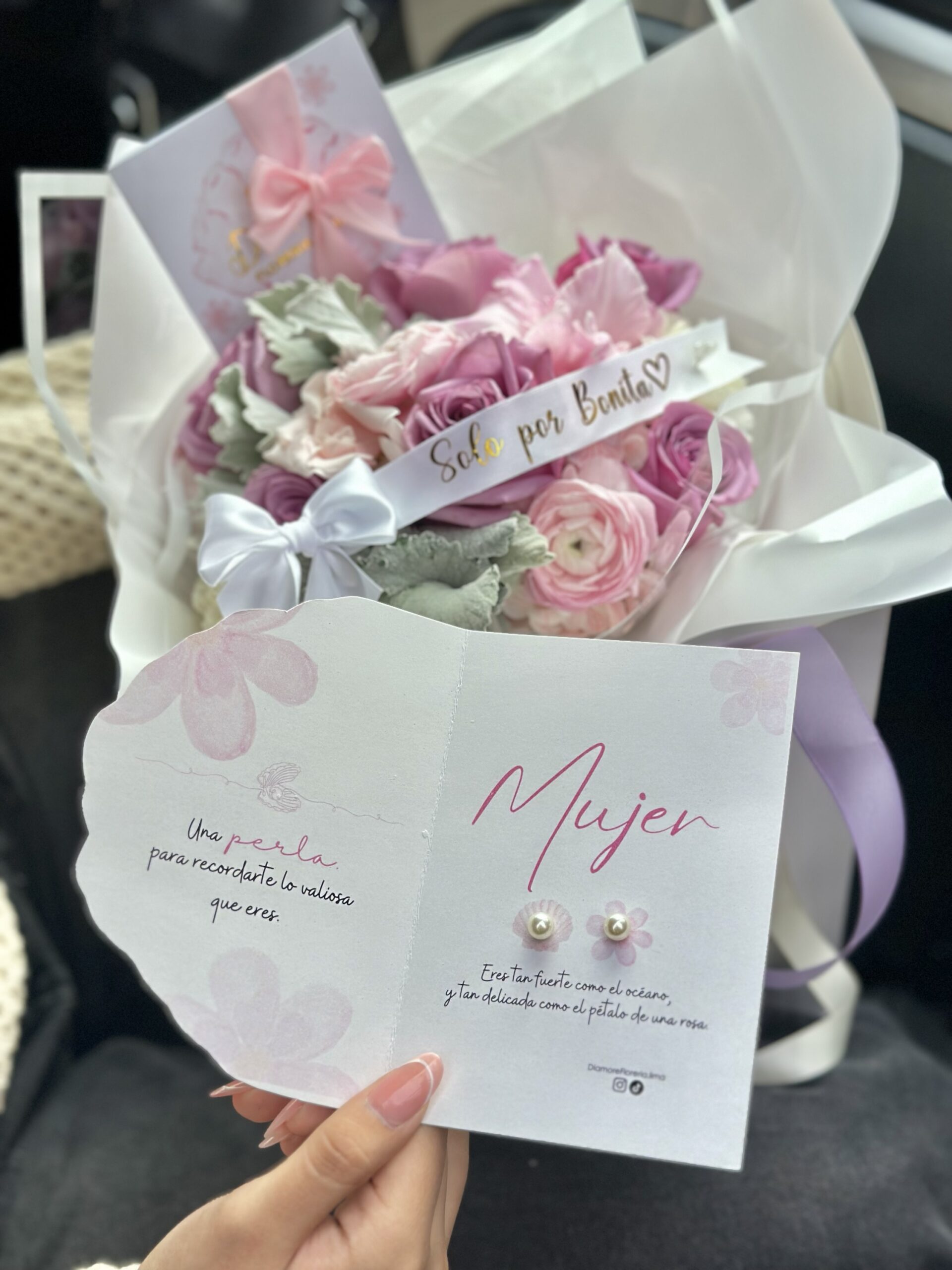 •Tarjeta del dÃa de la mujer + 02 aretes de perla blanca.